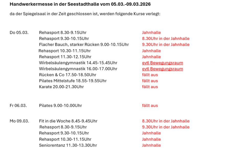 Aufgrund der Handwerkermesse am 07. und 08.03. in der Seestadthalle gibt es Kursverlegungen.